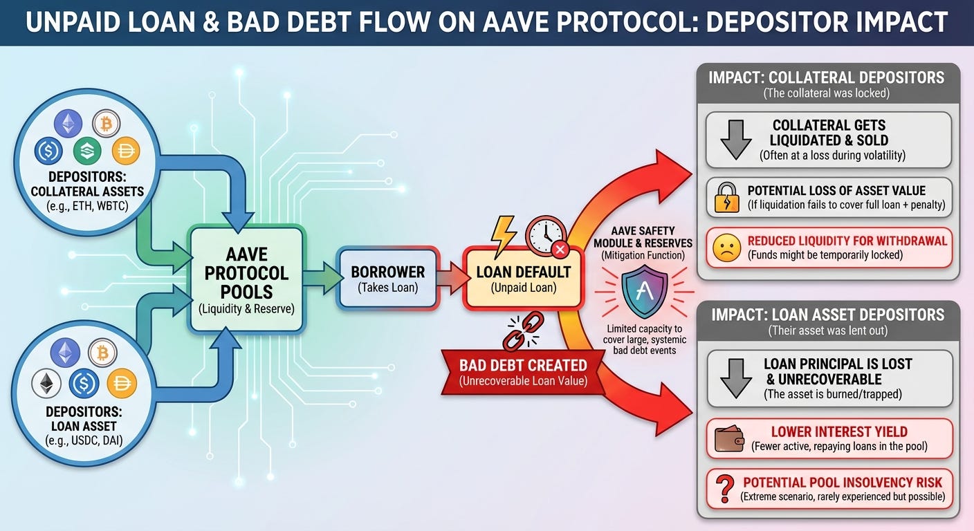 Bad debt hurts both groups because a deposit asset can only be withdrawn up to the unborrowed amount — that is, only the amount of an asset held by the pool and not currently given to a borrower.