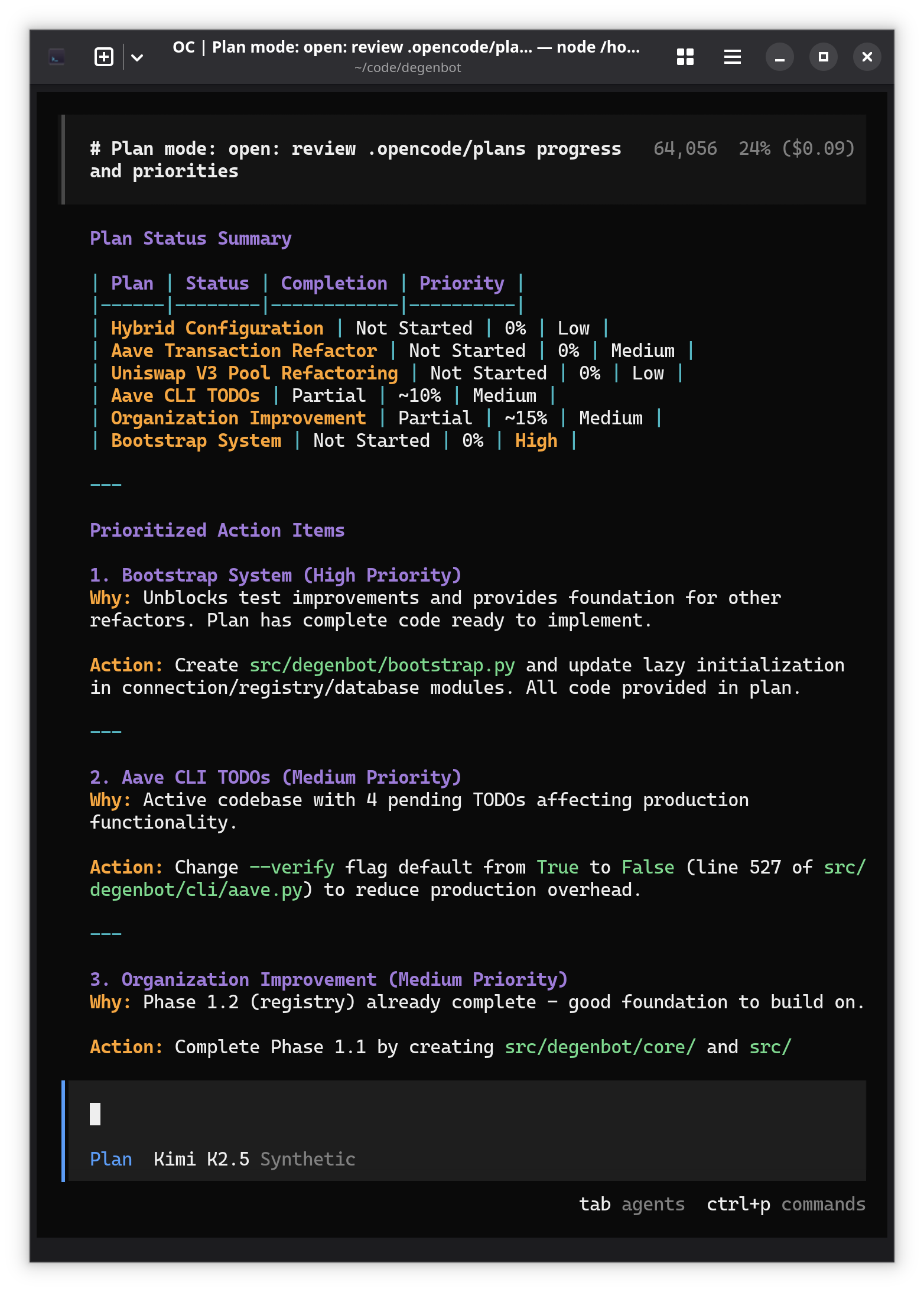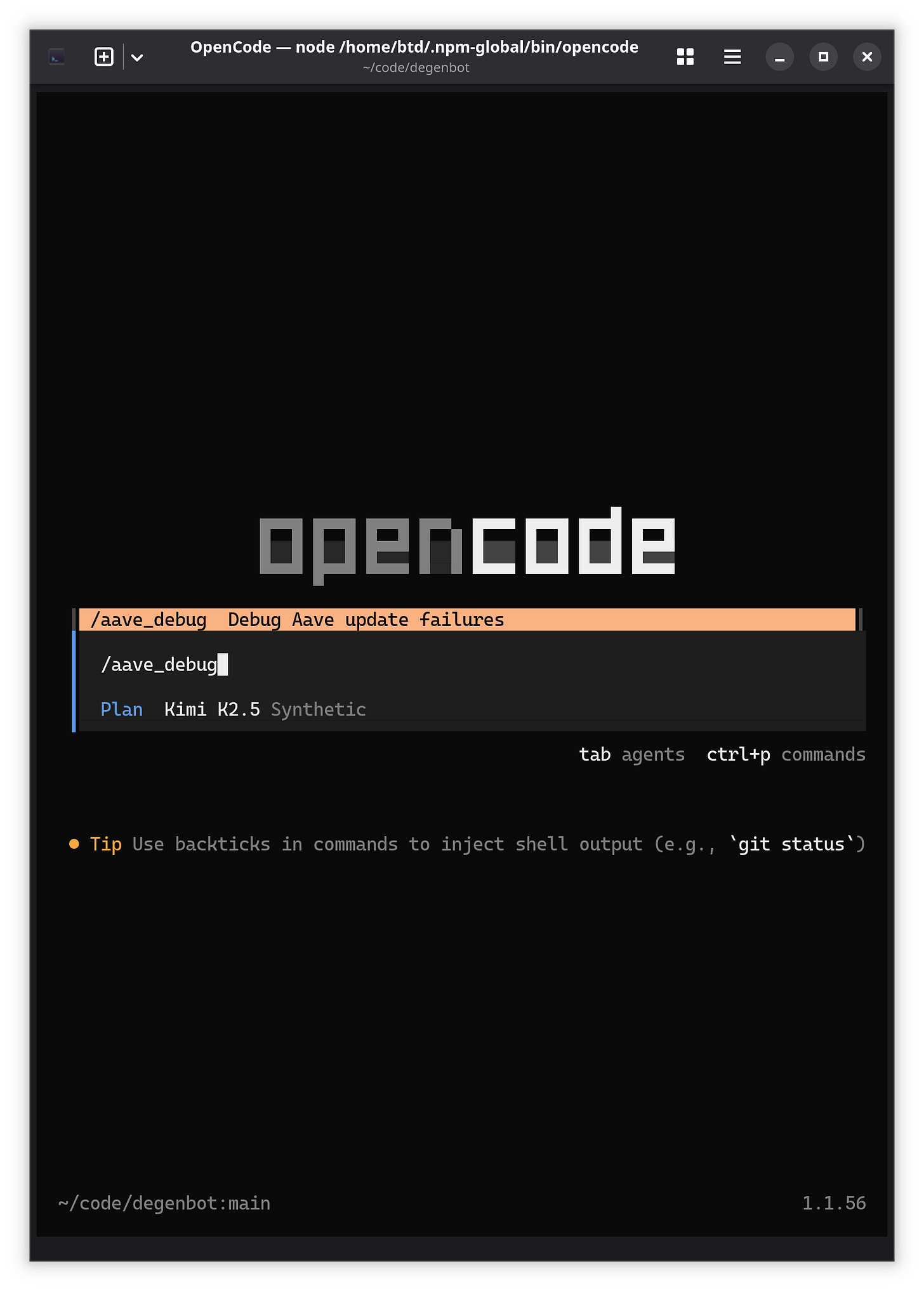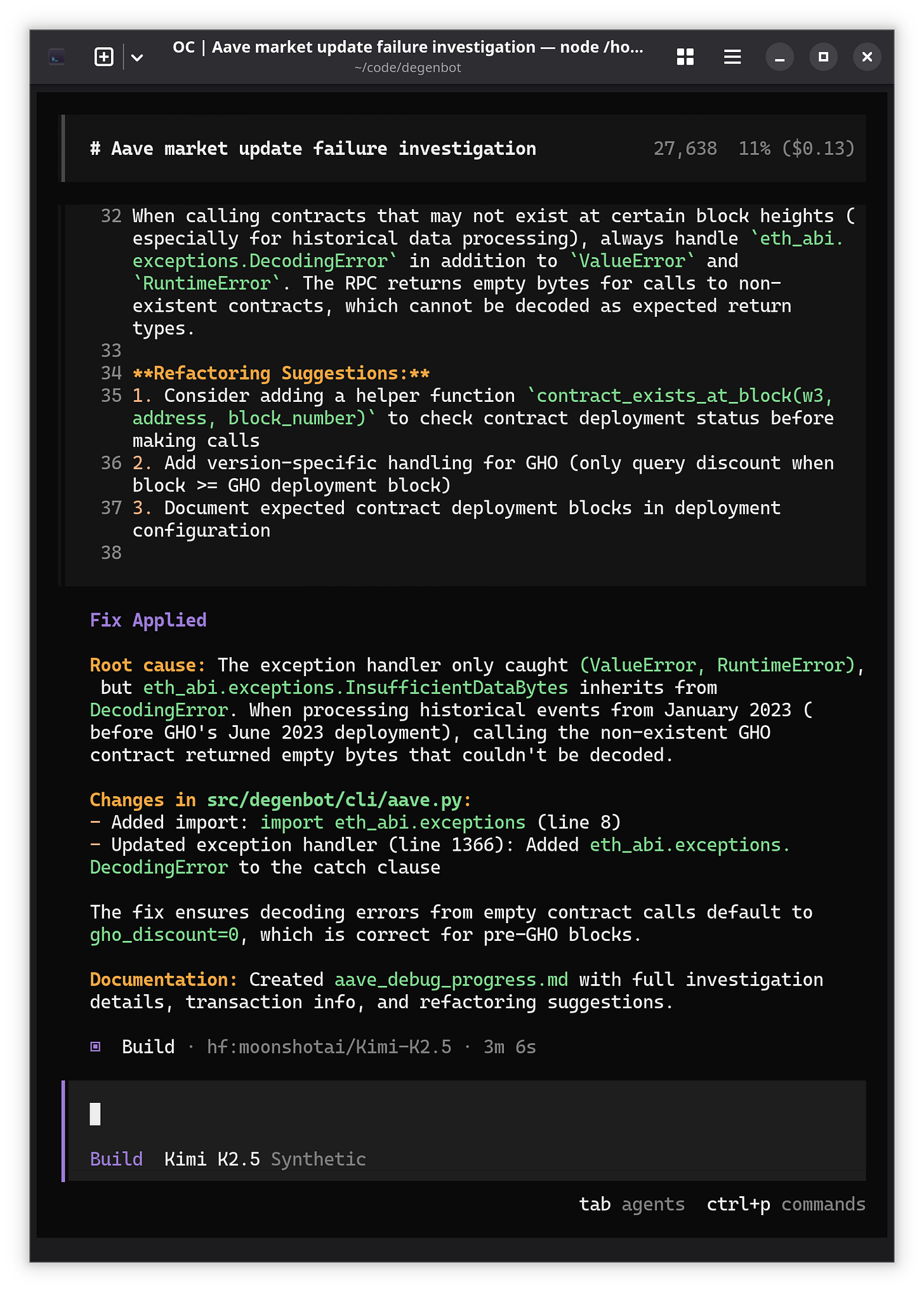 btd@dev:~/code/degenbot$ opencode run --command summarize