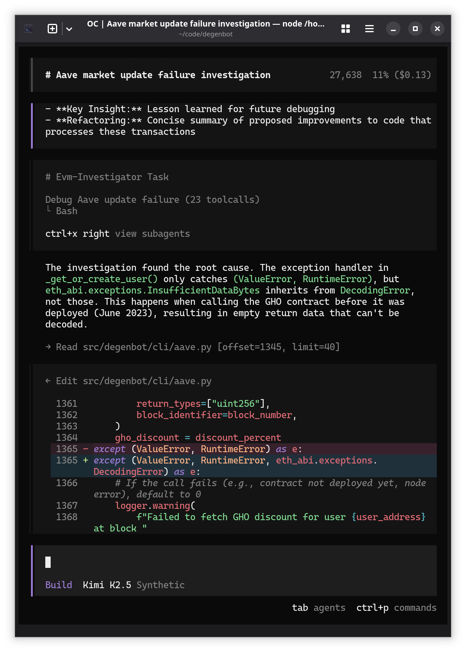 It’s also simple to write a command that glues the output of something run in a terminal to a subagent. This command runs my Aave updater after a failure, instructs the model to delegate investigating the transaction that caused it, then start a hands-off debugging effort that records lessons learned to a log: